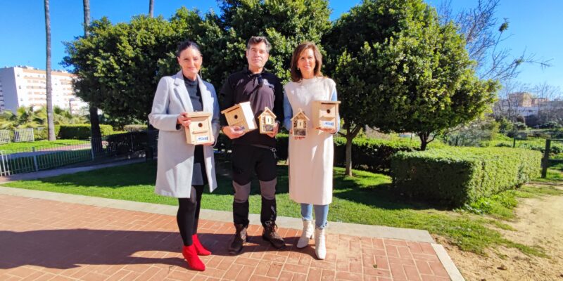 La concejal de Infraestructuras y Servicios Públicos del Ayuntamiento de Huelva, Mariló Ponce, acompañada por la directora de Sostenibilidad de Aguas de Huelva, Natividad Moya, han entregado al responsable del Aula de la Naturaleza del Parque Moret, Antonio Pino, unas cajas nido que favorecerán el albergue artificial de las aves del entorno.