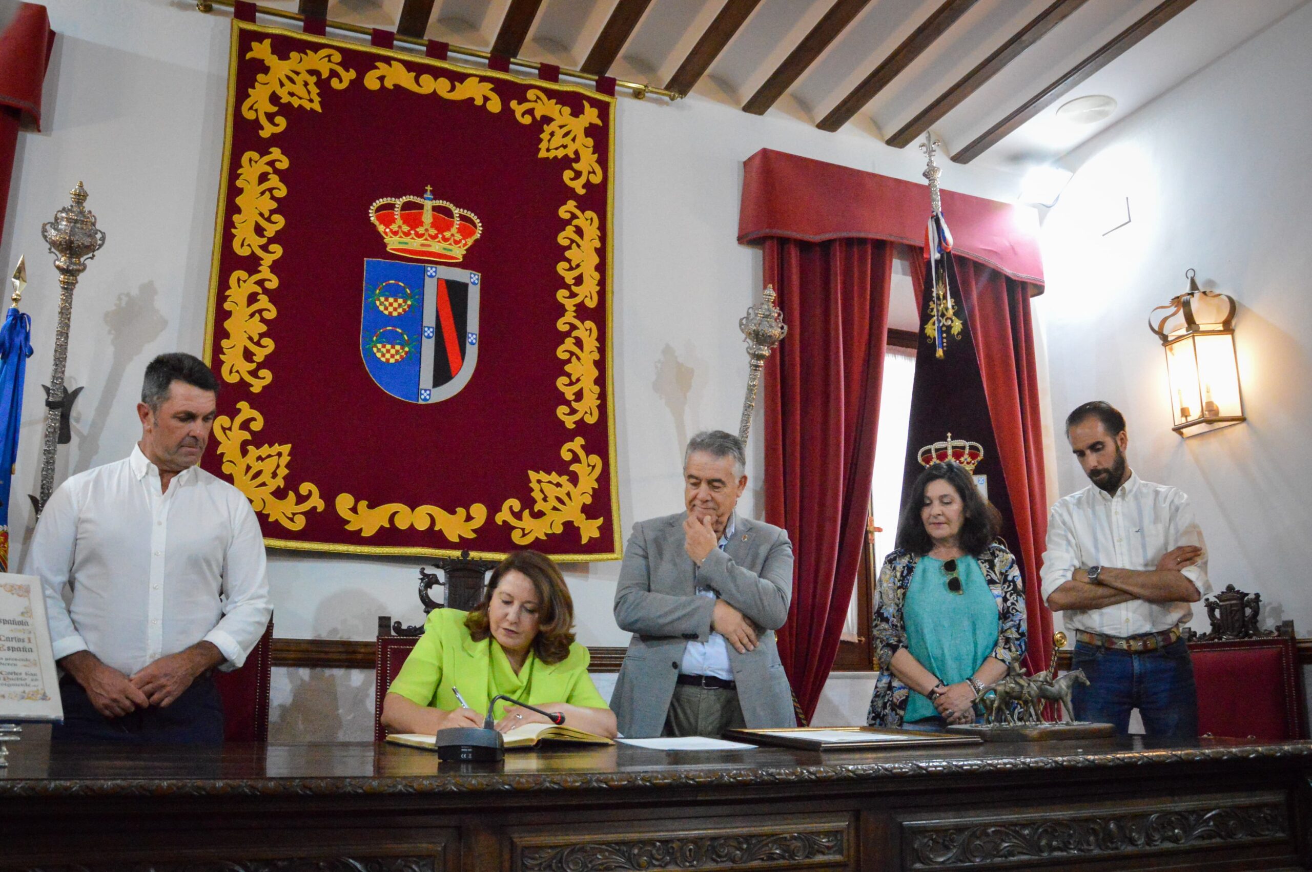 La eurodiputada electa Carmen Crespo visitó el pasado martes el Ayuntamiento de Almonte, en las horas previas a la Saca de las Yeguas, en un acto a iniciativa de la Asociación Nacional de Criadores de Ganado Marismeño donde, Diego Díaz, su presidente, quiso reconocerle el apoyo permanente a estas costumbres ancestrales de Almonte y su compromiso con la preservación de la raza marismeña.