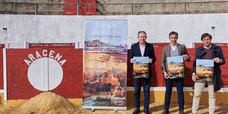 La Plaza de Toros de Aracena (Huelva) ha albergado la presentación oficial de la ‘Corrida de Toros Mixta’ que se celebrará el próximo miércoles 28 de Febrero -Día de Andalucía-, a las 17:00 horas. Un extraordinario cartel organizado por la empresa Plaza de Toros La Merced, en el que se lidiarán novillos-toros de la ganadería de D. José Luis Pereda para los rejoneadores Andrés Romero y Léa Vicens, y a pie los toreros David Fandila ‘El Fandi’ y David de Miranda.