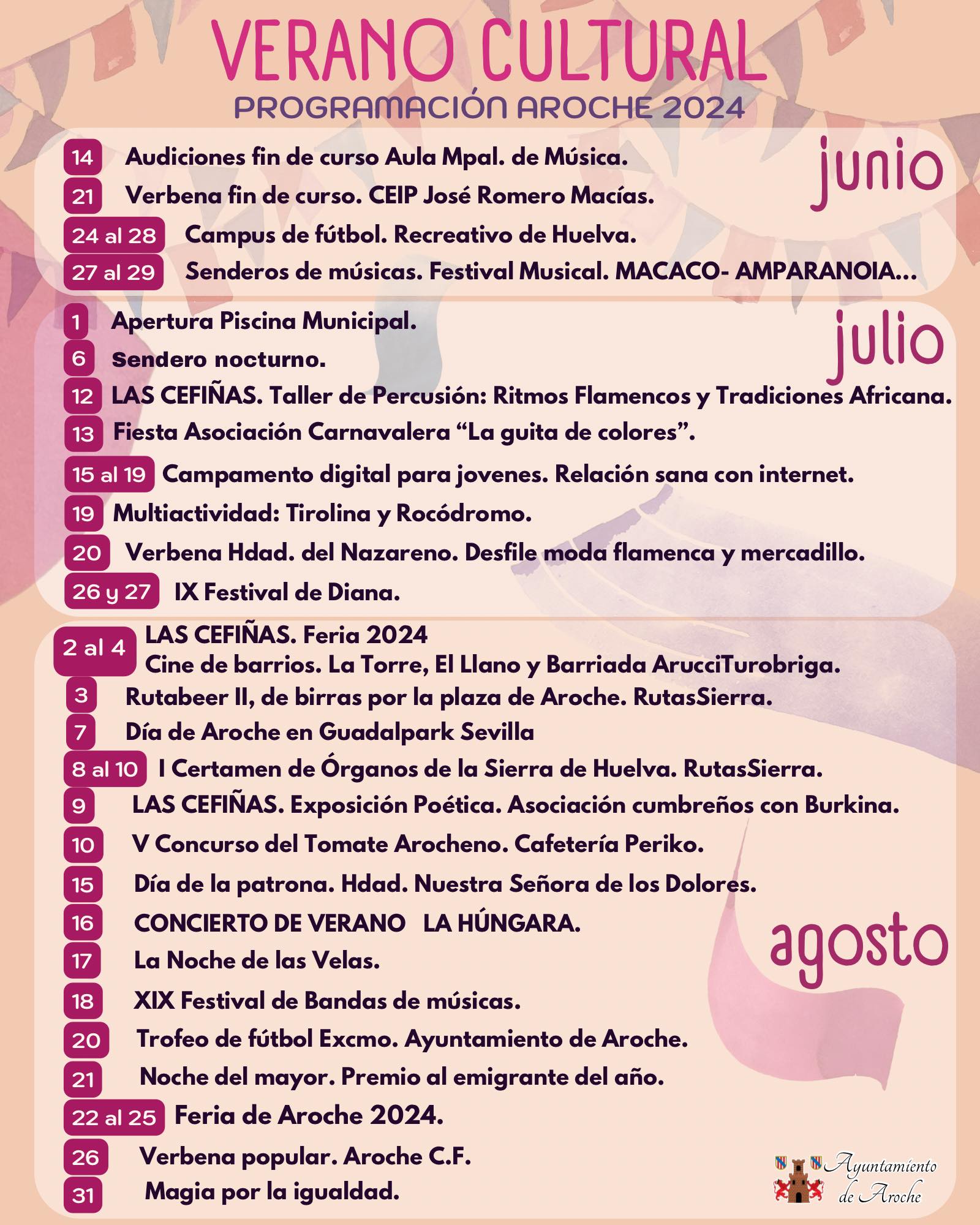 Sin duda, un verano hiperactivo que acaba de la mejor forma posible, la Feria de Aroche, que despega el día 21 en la Noche del Mayor y continúa con diferentes actos y sorpresas hasta el día 26 con la verbena popular que organiza el Aroche C.F. Cerrando el mes, el 31 de agosto, un gran espectáculo de Magia por la Igualdad podrá punto y final a unos meses donde “cultura, deporte, aprendizaje y ocio van de la mano para hacer de Aroche un pueblo activo y lleno de vida”, tal y como explica la alcaldesa de Aroche, Cristina Romero.