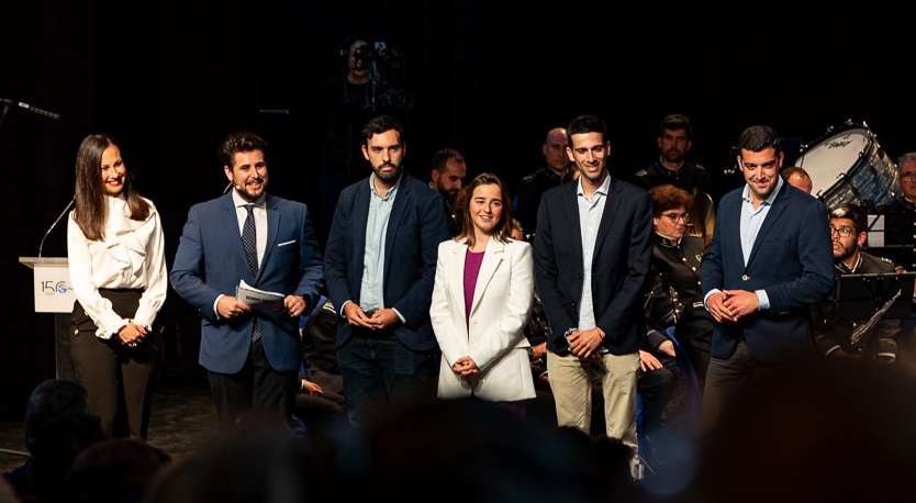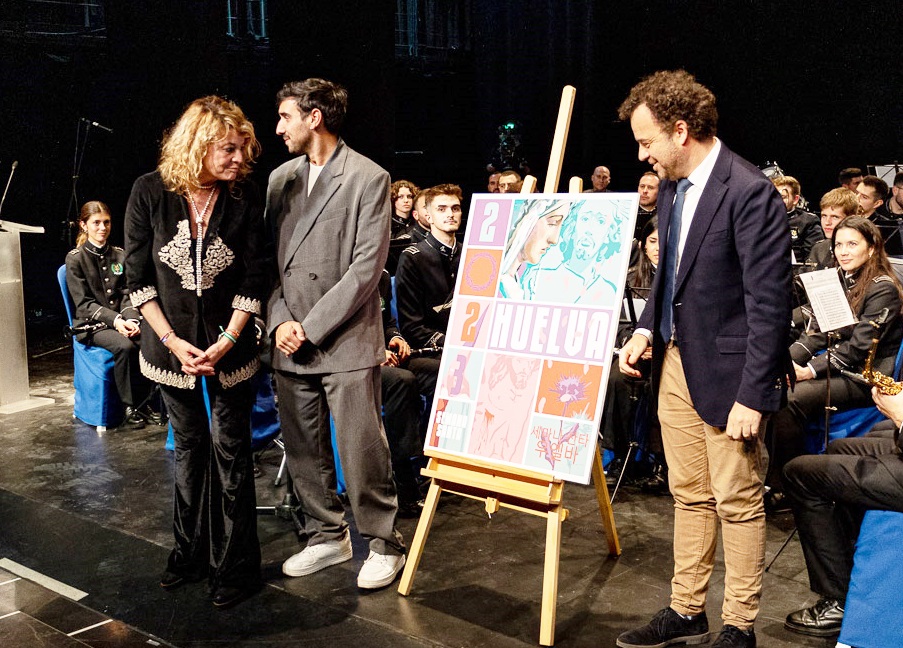 Cientos de cofrades han asistido a la presentación del cartel anunciador de la Semana Santa de Teleonuba en el transcurso de un concierto protagonizado por la Banda de Müsica Nuestra Señora de las Mercedes, este viernes, en Las Cocheras de Huelva.