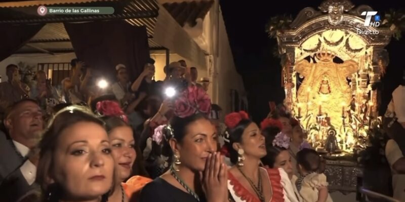 La llegada estuvo acompañada por el rezo del Ángelus, que se elevó entre cantes por sevillanas y repiques de campanas. Las mujeres, muchas vestidas de flamenca, entonaron salves mientras los hombres alzaban a hombros el simpecado durante los últimos metros hasta la casa hermandad, donde se vivieron escenas de intensa devoción.