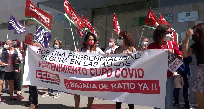 CCOO se ha manifestado hoy en la Delegación de Educación de Huelva para exigir una bajada en el ratio, de tal forma que se produzcan mejoras en el sector de la enseñanza. Así, la propuesta presentada mantiene que se tengan 15 alumnos en Infantil, 20 en Primaria y Secundaria y 25 en Bachillerato.