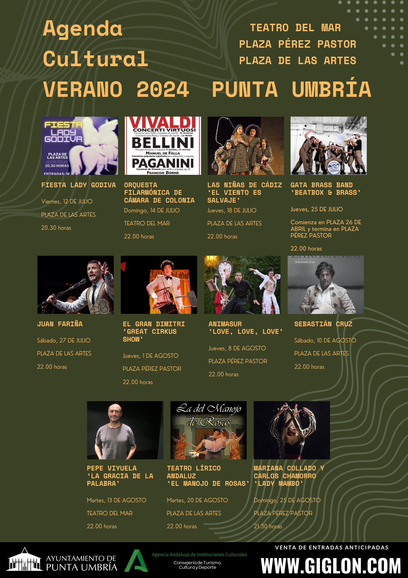 Entre los grandes eventos de artes escénicas, destacado la fiesta homenaje a la discoteca Lady Godiva en la plaza de las Artes el 12 de julio, la conocida compañía de las Niñas de Cádiz que estará el 18 de julio en la plaza de las Artes con su espectáculo ‘El viento es salvaje’, o el actor Pepe Viyuela en el Teatro del Mar con ‘La gracia de la palabra’ el 13 de agosto.