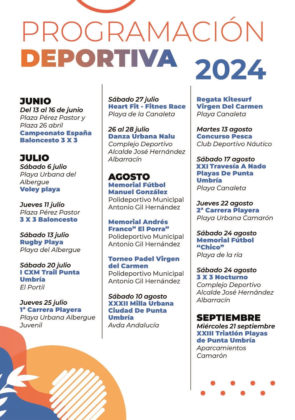 En Deportes, a las citas tradicionales se suman algunas nuevas como el primer CXM Trail de Punta Umbría el 20 de julio, el Fitnes Race en La Canaleta que será el 27 de julio o un evento de danza urbana de la mano de Nalú del 26 al 28 de julio.