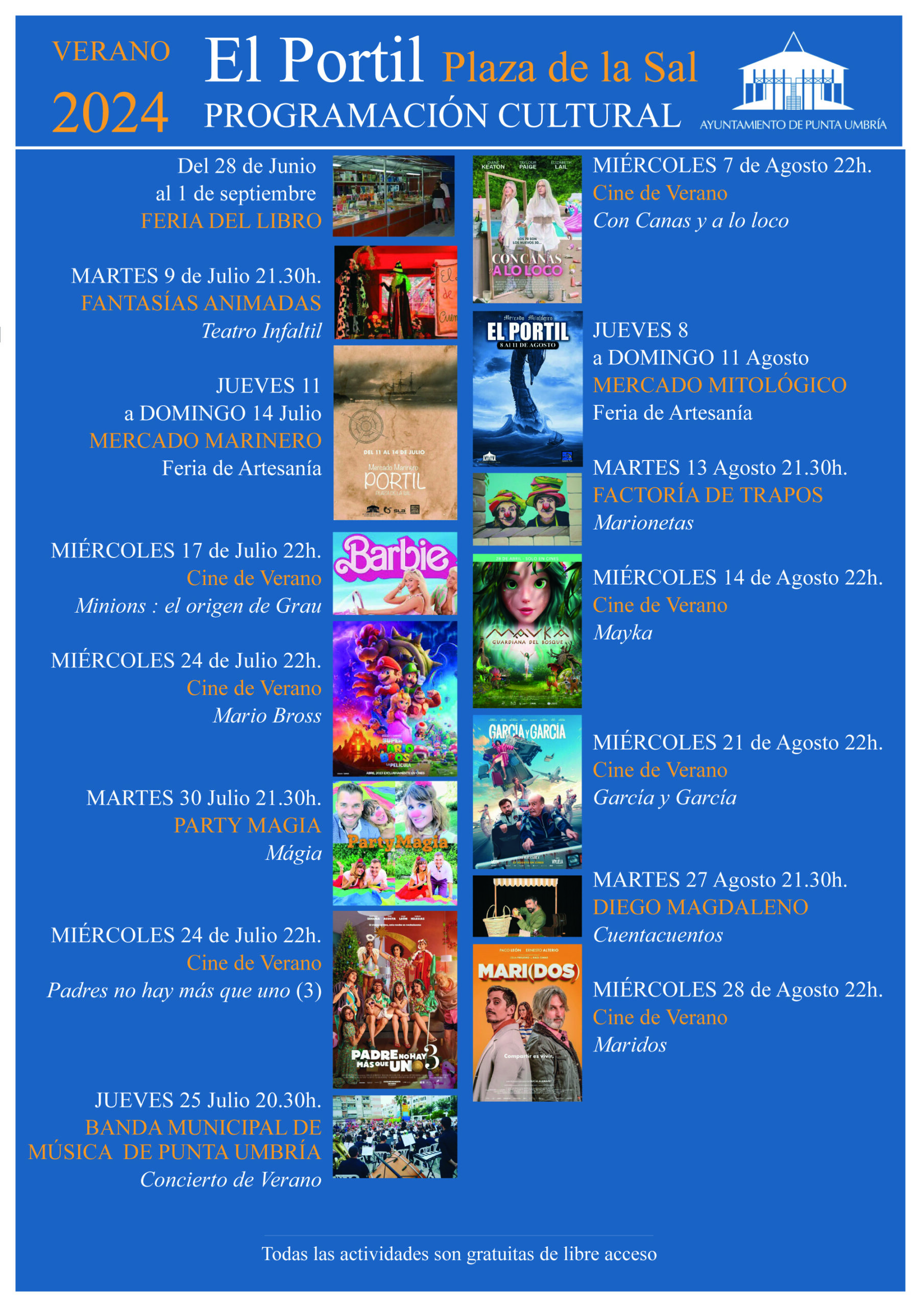 También ha subrayado la voluntad de crear una programación para todas las edades, “que enriquezca la oferta de sol y playa”. Habrá casi 100 actividades culturales: 21 espectáculos de teatro, música y danza; 13 exposiciones, 45 actos literarios, 7 proyecciones cinematográficas, así como las tradicionales Ferias del Libro y Artesanía, tanto en Punta Umbría como en El Portil.