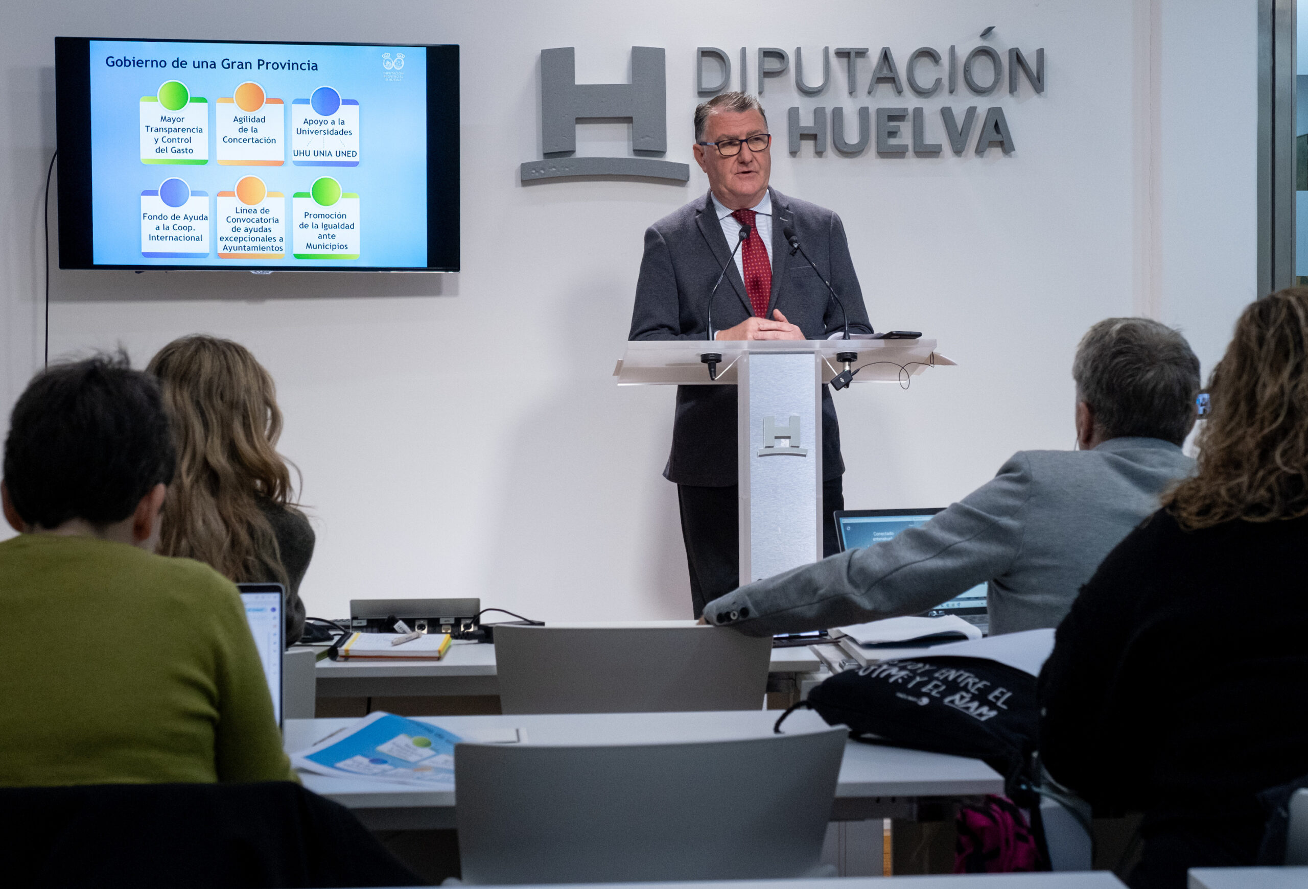 Respecto a los propósitos y líneas de actuación que persigue el equipo de Gobierno con las cuentas provinciales, el vicepresidente ha destacado una mayor transparencia y control del gasto; la agilidad en la concertación; apoyo a las Universidades (UHU, UNIA y UNED), fondo de Ayuda a la Cooperación Internacional; Línea de Convocatorias de Ayudas Excepcionales a los Ayuntamientos (como ha ocurrido con los incendios de Bonares y Chucena o la borrasca Bernard) y la promoción de la igualdad entre los municipios de la provincia de Huelva.
