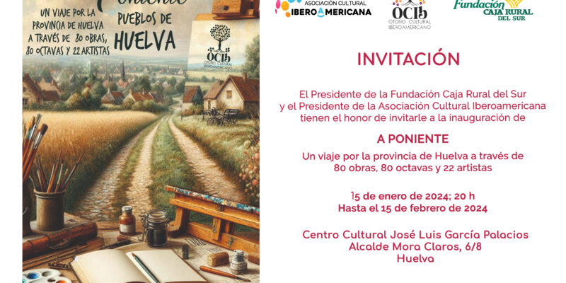 El Otoño Cultural Iberoamericano (OCIb) sigue adelante con sus propuestas artísticas una vez finalizada su 16ª edición de 2023, en este ocasión con una exposición pictórica y poética sobre la provincia de Huelva que se mostrará al público a partir del próximo lunes 15 de enero en el Centro Cultural José Luis García Palacios de la Fundación Caja Rural del Sur.