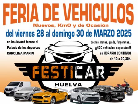 Festicar, La fiesta del motor llega por primera vez a Huelva. Con gran acogida por parte del Ayuntamiento de Huelva, Festicar se ubicará en los anexos del Palacio de Deportes Carolina Marín durante los días 28, 29 y 30 de marzo, en horario continuo de 10:00 a 20:30.