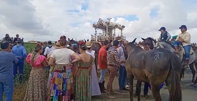 La carreta del Simpecado de la Hermandad del Rocío de Isla Cristina ha sufrido en la mañana de este miércoles un incidente en el que se ha visto implicado un coche y que ha provocado que los mulos se hayan desbocado, sufriendo uno de ellos diversas heridas.