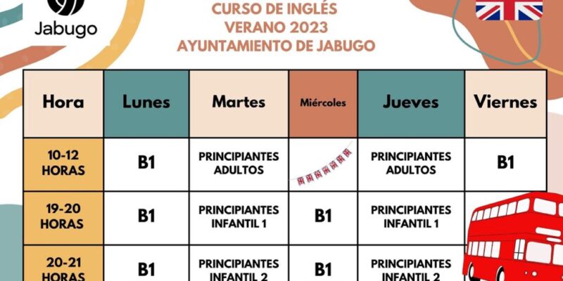 Puede ser una imagen de texto que dice "Jabugo Horario CURSO DE INGLÉS VERANO 2023 AYUNTAMIENTO DE JABUGO Hora Lunes 米 Martes Miércoles 10-12 HORAS Jueves B1 Viernes PRINCIPIANTES ADULTOS I 19-20 HORAS B1 PRINCIPIANTES ADULTOS B1 PRINCIPIANTES INFANTIL 1 B1 20-21 HORAS B1 PRINCIPIANTES INFANTIL1 PRINCIPIANTES INFANTIL 2 B1 PRINCIPIANTES INFANTIL2"