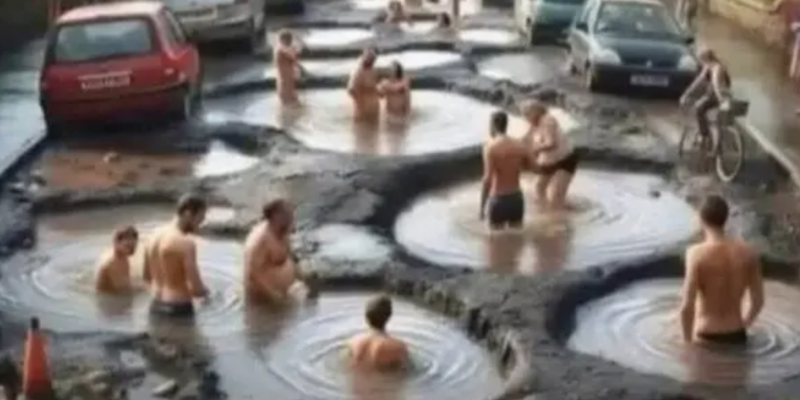 En dicha imagen, critican que los baches y socavones, junto a las intensas lluvias de los últimos días, se han convertido en prácticamente piscinas en las que la población se puede bañar.