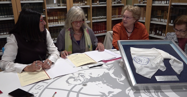 Símbolo de la resistencia y la lucha por los derechos humanos. La Universidad de Huelva ha recibido la donación del pañuelo de las Abuelas de la Plaza de Mayo de Buenos Aires por el seminario “Mujer Latinoamericana. Mujer Andaluza”, constituido en el año 1995. Un símbolo del dolor, la indignación y la lucha de las mujeres a quienes les arrebataron sus bebés y niños durante la dictadura militar Argentina del último cuarto del pasado siglo.