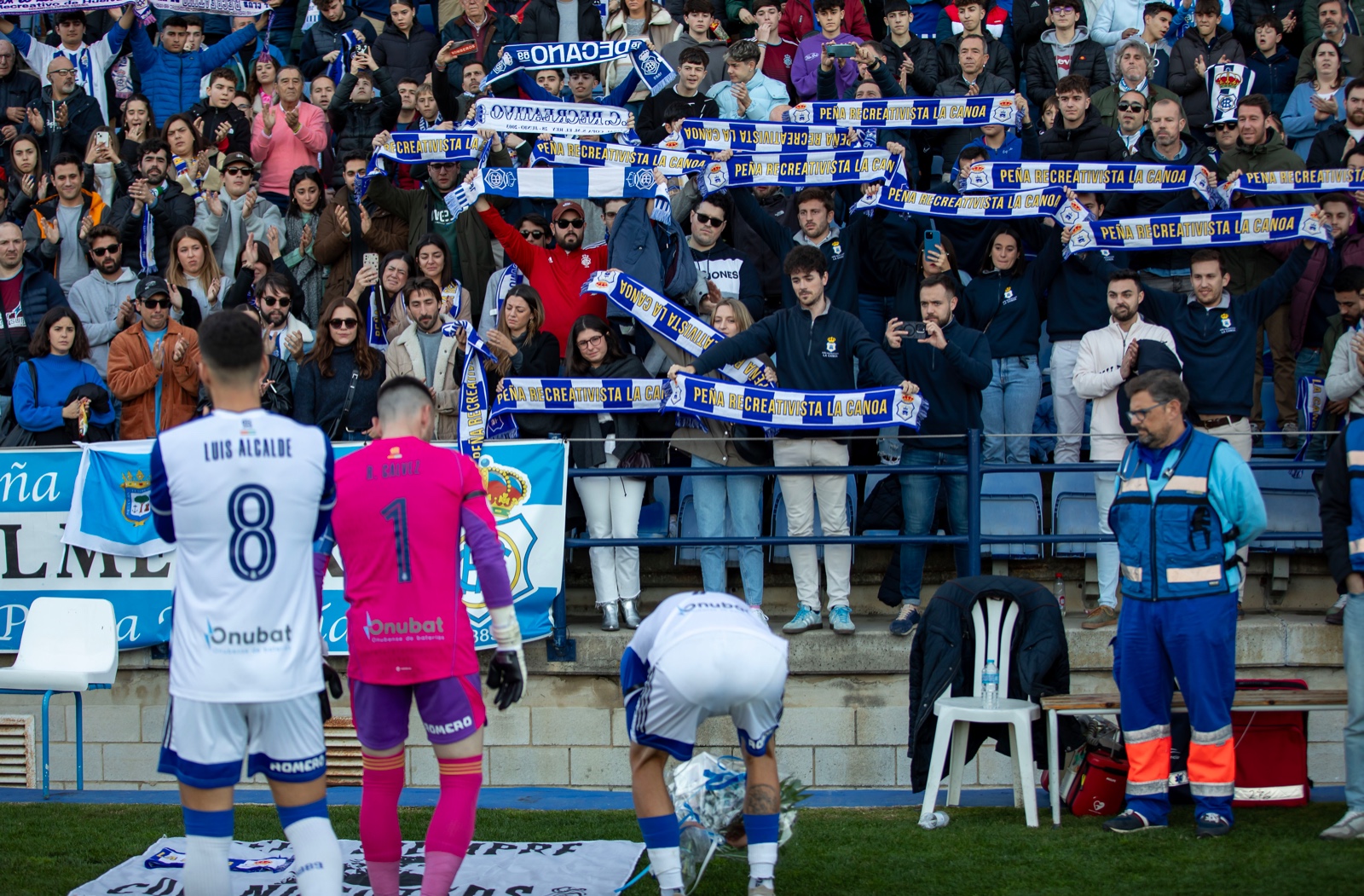 El Recreativo de Huelva, antes del inicio del encuentro, tuvo un bonito gesto entregando un ramo de flores en el césped del equipo de sus amores. Pepito se fue a disfrutar de su eterna juventud y sonrió con cómo sus amigos , su Canoa y su Recre le brindaban un bonito homenaje.