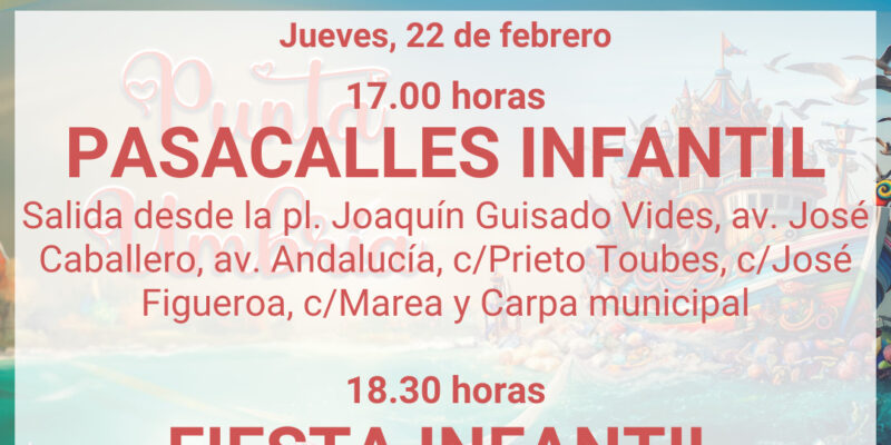 El pasacalles infantil del Carnaval de la Luz de Punta Umbría recorrerá mañana jueves, 22 de febrero, las calles de la localidad desde la plaza Joaquín Guisado Vides, en la que está prevista la salida a las 17.00 horas. Los pequeños llegarán hasta la carpa de la Plaza de las Artes pasando por José Caballero, Avenida de Andalucía, Prieto Toubes, José Figueroa y Pargo.