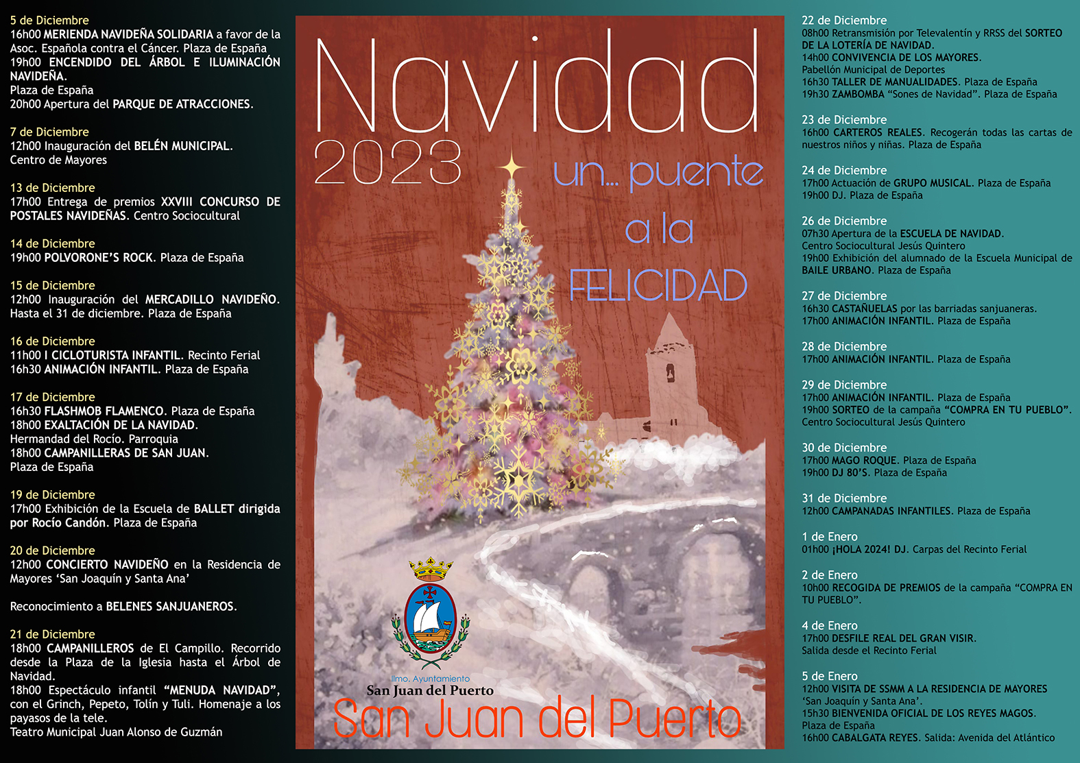Arranca el mes de diciembre y San Juan del Puerto lo tiene ya todo listo para celebrar la Navidad como viene haciéndolo en los últimos años. Es quizá la época donde la participación ciudadana y el disfrute de todo un pueblo son los ejes centrales llevando consigo una serie de significados y tradiciones que contribuyen a la importancia de este mes en las fiestas navideñas. Hoy, la alcaldesa Rocío Cárdenas, acompañada de los concejales de Emprendimiento y Juventud, Educación, Cultura y Turismo, ha dado a conocer el programa preparado desde el consistorio cuyo lema es “Navidad 2023, un puente a la felicidad”. Cárdenas dijo “queremos que a través de este puente que es la Navidad crucemos al otro lado, al de la alegría y sueños, por lo que invitamos a todos a participar de las actividades”.