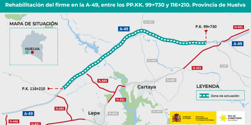El Ministerio de Transportes y Movilidad Sostenible ha licitado por un importe de 14,86 millones de euros (IVA incluido) un contrato de obras para la rehabilitación de 16,5 kilómetros de firme en la autovía A-49, entre los kilómetros 99,730 y 116,210, a su paso por los municipios de Cartaya y Lepe, en la provincia de Huelva.